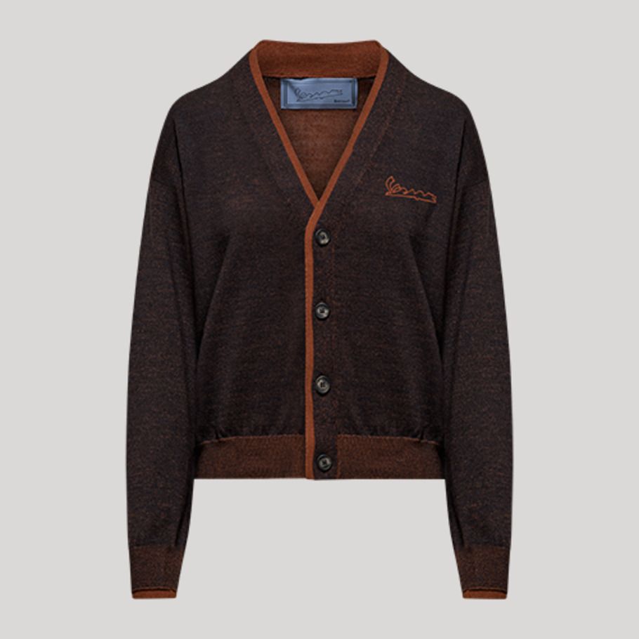 Áo khoác cardigan dệt kim hai lớp từ bộ sưu tập Thu Đông 2025 của Vespa được làm từ chất liệu len pha lụa mềm mại. Áo có cấu trúc dệt kim hai lớp, với viền màu xanh nhạt tương phản ở phiên bản màu xám và tông màu thuốc lá ở phiên bản màu đen. Với tay dài, cổ chữ V và hàng cúc phía trước, chiếc áo được hoàn thiện với logo Vespa thêu ở vị trí trái tim, tạo nên điểm nhấn độc đáo và tinh tế.