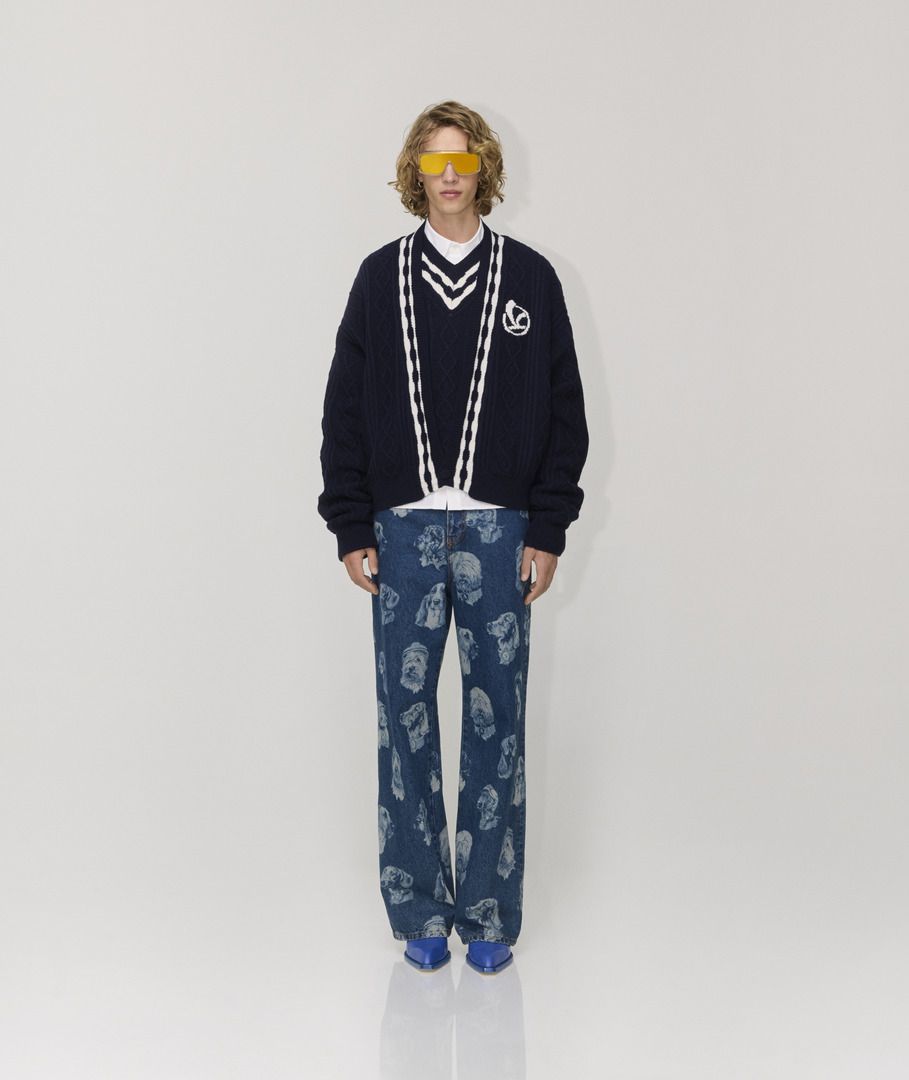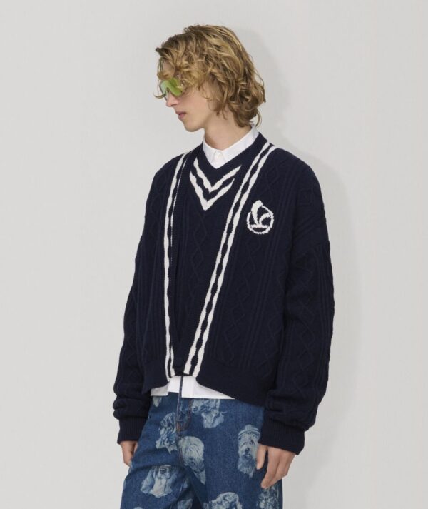 Áo khoác cardigan dệt kim kiểu cáp của Vespa thuộc bộ sưu tập Thu Đông 2025 được làm từ chất liệu len cashmere mềm mại. Áo có phom dáng thoải mái với tay dài, vai rủ, cổ chữ V và cài cúc phía trước. Vừa tiện dụng vừa thiết yếu, áo có hai túi viền phía trước. Các chi tiết tương phản theo phong cách sinh viên ở đường viền cổ và logo chữ V thêu nổi ở vị trí trái tim tạo nên điểm nhấn cho trang phục, trong khi các chi tiết dệt kim bện tạo thêm kết cấu tinh tế và độc đáo.