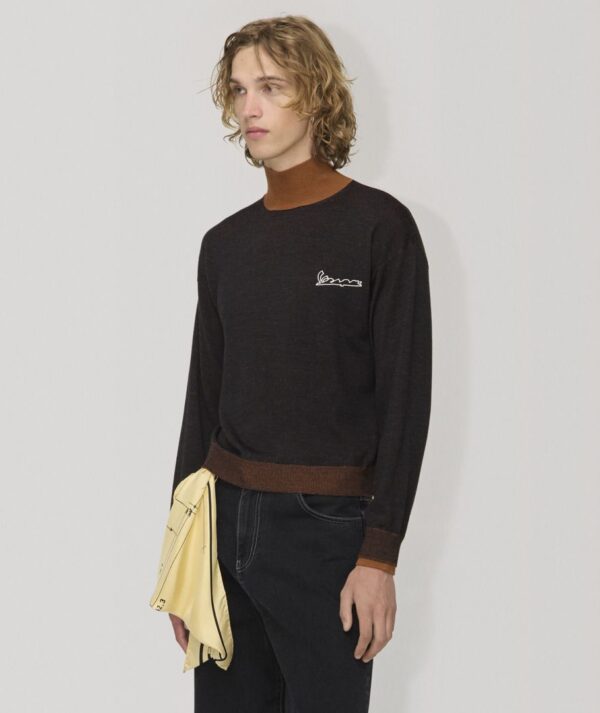 Áo len cổ cao hai lớp từ bộ sưu tập Thu Đông 2025 của Vespa được làm từ chất liệu len pha lụa mềm mại. Áo có cấu trúc đan hai lớp với viền màu nâu thuốc lá tương phản. Thiết kế tay dài và logo Vespa thêu ở vị trí trái tim tạo nên một item không bao giờ lỗi mốt.