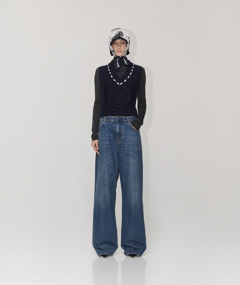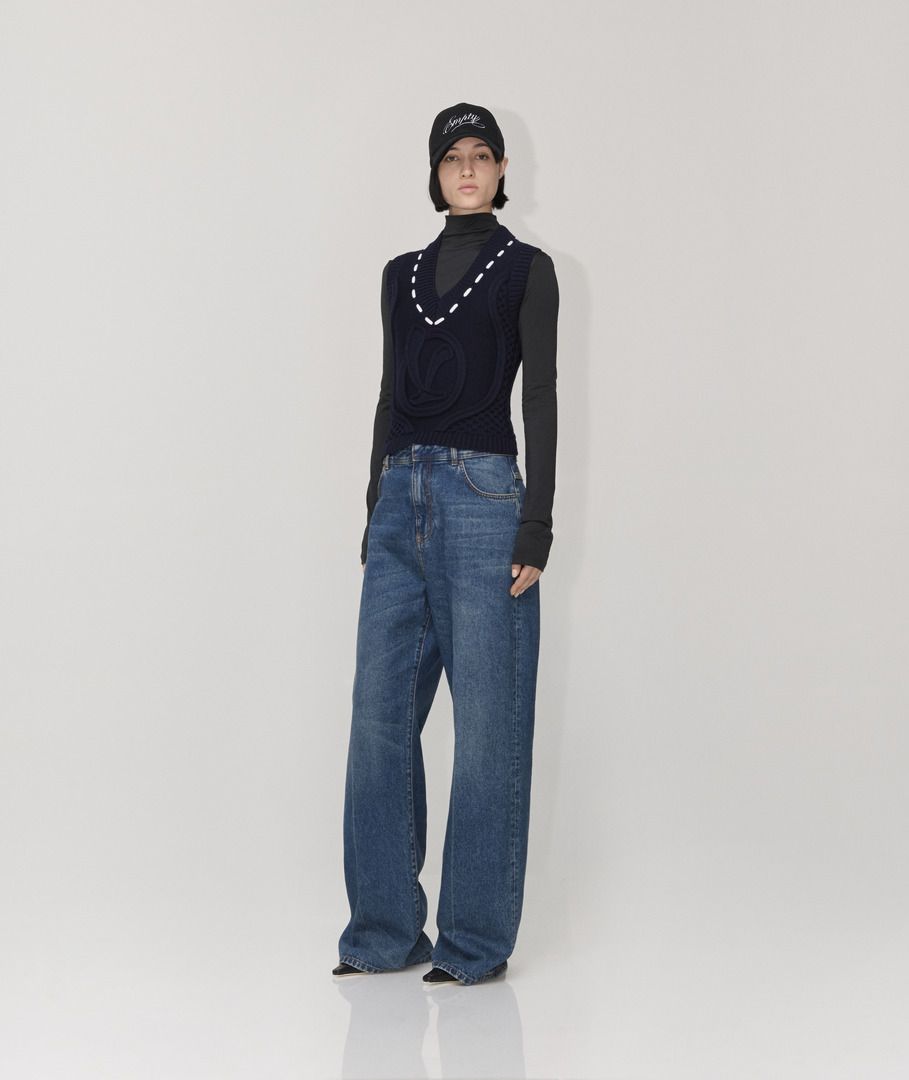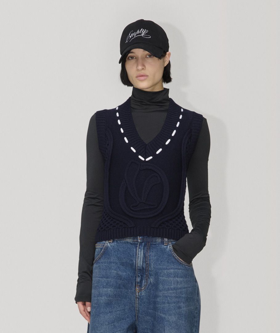 Áo vest thêu logo Vespa thuộc bộ sưu tập Thu Đông 2025 được làm từ sợi len nguyên chất mềm mại. Áo có thêu logo chữ V cỡ lớn cùng tông màu bằng mũi đan, trong khi chi tiết ruy băng trắng ở cổ chữ V mô phỏng đường may nổi. Toàn bộ áo được dệt không đều tạo nên vẻ ngoài độc đáo và tinh tế.